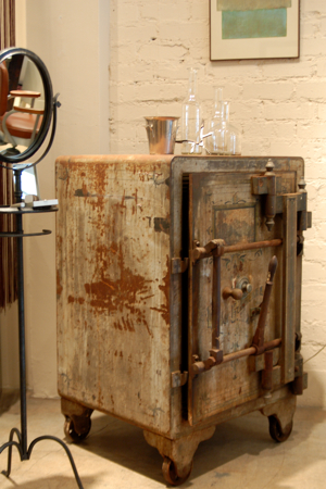 This vintage safe from Rehab Vintage is a bit expensive, but it is a good example of late 1900’s safes. It weighs about 3,000 lbs and is replete with tear gas containers behind the lock.