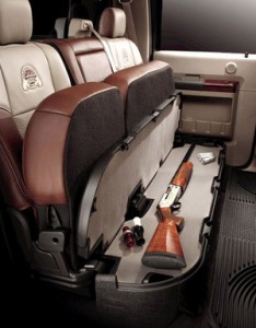 The 2009 Ford F-250 Super Duty Cabela’s Edition truck included this hidden compartment for “equipment” underneath the seat. It’s perfectly suited, and looks to be intended for long gun storage and transport.