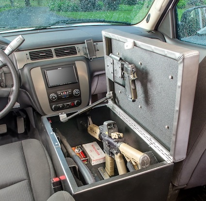 This console bunker stores multiple firearms and works with the automatic door locks. – Source: http://bedgunsafe.com/law-enforcement