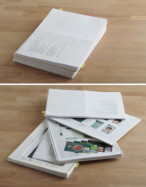 I’m not sure of any details on this stash, but it’s custom and intriguing. It could be used by itself, maybe with rubber band or string around it to keep it in one piece. It definitely makes you look less like a traveler and more of a local worker if that’s all you were carrying, but would be awkward to handle. You could have it in your briefcase or backpack to deter theft, but you still risk the whole item being stolen. Does anyone know the original idea behind this?
