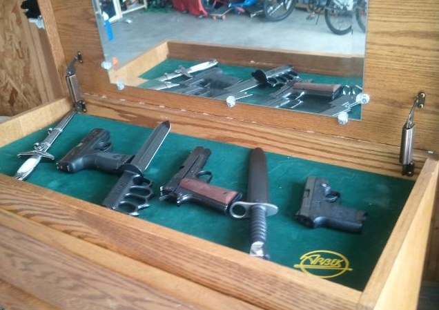 This solid oak dresser, being sold on Armslist, includes a secret compartment under the lift-up top that can conceal knives, guns, jewelry, or other valuables.