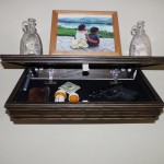 This handmade oak wall shelf we found on Etsy has a secret drop down shelf hidden inside. The top shelf stays flat to keep from disturbing anything on display. The drop down compartment has a felt lined interior held closed by a magnet lock. To open you place a wooden barrel with a neodymium magnet near the latch.