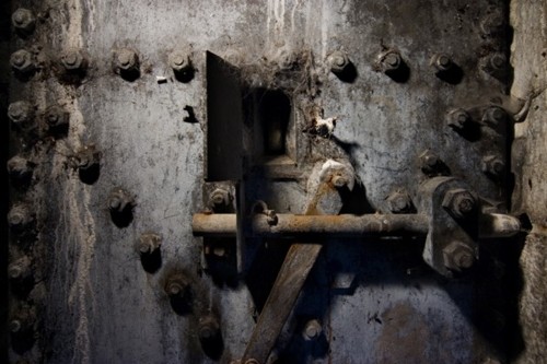 Secure latching mechanism for steel door – Source: http://crumblingintomylastlifeline.tumblr.com/post/10141685905