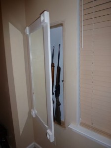 This hidden gun storage was custom built into a wall and concealed with a hinged mirror. – Source: http://www.instructables.com/id/Hidden-Gun-Cabinet-with-hidden-keypad/?ALLSTEPS