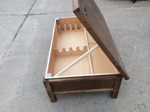 This coffee table opens to reveal storage for 4 long guns and 2 boxes of ammo. – Source: http://www.therusticacre.com/Recent-Projects.html