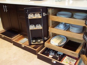 Multiple toekick drawers installed under a cabinet provide convenient additional storage space and hidden stash spots for any private items or supplies.