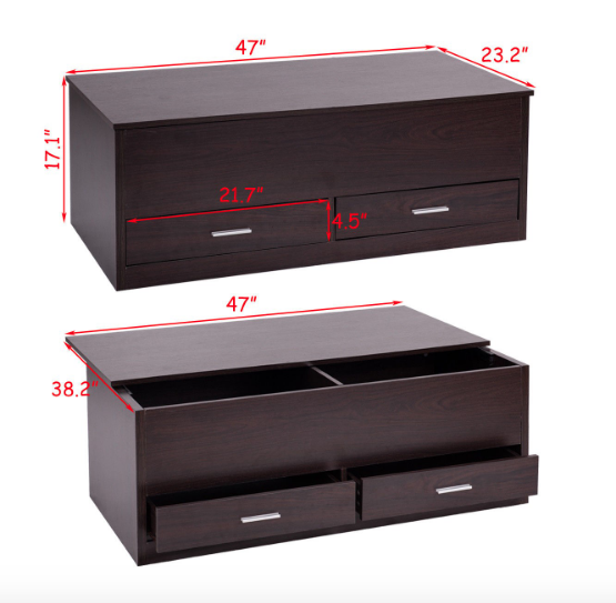 This coffee table contains two visible drawers, as well as hidden storage under the sliding top.