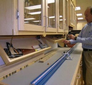 We love these custom trays that fold down from the cabinets in the Wood Magazine Workshop. These would be nice in the shop, or the kitchen to hold spices, utensils and other flat or awkward items. Wood Magazine has a complete guide on how to make your own hidden trays that fold down from the cabinets here.