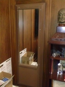 This sliding mirror conceals a secret sink from the prohibition era. – Source: http://imgur.com/a/Cd4wI