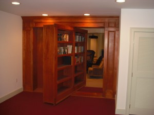 Eckelman Brothers Construction built this custom rotating bookshelf door to conceal the entrance to a client’s home office.