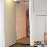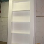 One of the custom contractors we know recently built this swing-out secret bookcase door to access a hidden basement room. The construction is pretty straightforward with a white trim piece on the right to cover the seam when the door is closed.