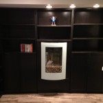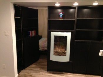 The door was hung on a heavy-duty piano hinge and trim was added to the bottom of the moving shelf. A custom latch opens the door by tilting a secret book on the shelf. I space heater was mounted in the center of the wall. The final result is a beautiful, functional wall that completely hides the living space behind.