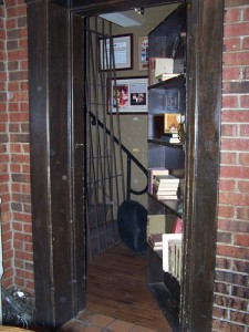 Secret Bookshelf Door Conceals Hidden Staircase by Chad King | Feb 2, 2012 | Stash Pics | 0 comments HIdden Stairs Behind Secret Bookcase Door This custom built swing-in hidden bookcase door opens to reveal a secret room and staircase.