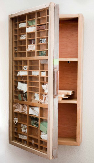 This printer tray is mounted vertically to the wall on hinges, which allows for secret compartments behind.