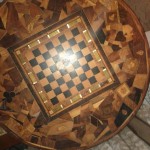 This card table was crafted from 80 different types of wood, and includes a secret card storage compartment under the lift up chessboard.