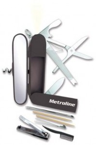 Amazon features this Metroline Grooming Multi-tool Kit that includes grooming tools such as a mirror, flashlight, nail clippers, toothpicks, tweezers, mustache comb, nail file and secret compartment along the side.
