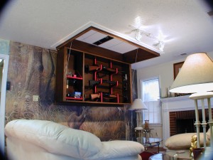 These cabinets from UpAndAwayStorage.com look a bit dated, but the concept is timeless. Push a button and the full cabinet loaded with rifles or other valuables swings down from the ceiling for access and display.