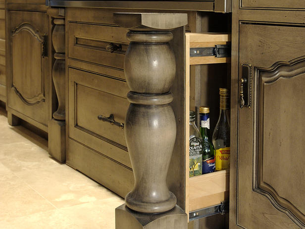 Kitchen cabinets with intricate moldings and decorations provide additional options for concealed storage. This secret drawer concealed behind a decorative leg shown on HGTV is a perfect example.