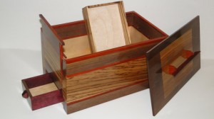This finely crafted jewelry box, available on Etsy, includes a secret compartment. – Source: http://www.etsy.com/listing/115476340/walnut-zebrawood-padauk-and-purpleheart?ref=similar_items_sash