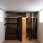 This modern wood panel wall opens up to reveal a series of shelves, storage drawers and even a secret door. With a bit of planning, this could be replicated in many situations.