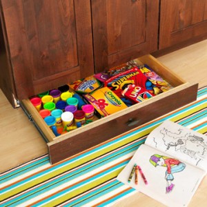 Incorporating a secret drawer in the toekick of cabinets makes a great station for kids to store their supplies. It’s easy for them to access and out of your way, as long as it’s closed.