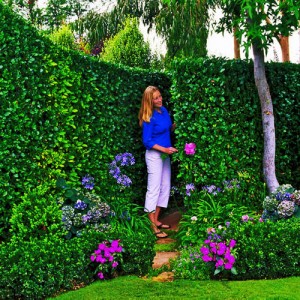 These laurel cherry hedges were planted parallel to each other, 2 1/2 feet apart with staggered gaps. From most angles in the garden, the two hedges blend together and the path between them is unnoticeable. They are trimmed 3-4 times a year to maintain their crisp shape.