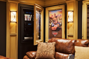 Behind a hinged painting, picture frame, or movie poster is a great place to store media equipment, as seen in this traditional home theater featured on Houzz.