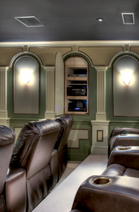 This media rack in a home theater is concealed by a secret swing-out wall accent panel.