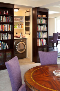 This secret bookcase door from Lindy Donnelly slides sideways to reveal a concealed laundry room. The bookcase is custom and uses skateboard wheels to roll on.
