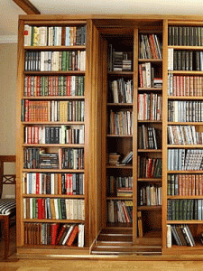 These sliding bookcases move to reveal additional storage space behind. This method could also be used for a moving bookcase entry or doorway, though these have highly visible rails.