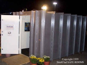 SteelClad is a line of shelters from Shelters of Texas designed to protect from extreme weather and intruders. Each SteelClad Safe Room is customized with your choice of digital communication jacks, electrical outlets and ventilation for central heating and air conditioning. The structure is meant to be encased in steel reinforced concrete for superior protection against flying debris and projectiles. The room pictured here is room 12ft by 8ft and 7ft tall.