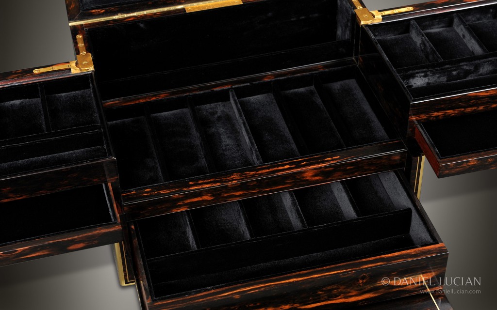This antique jewelry box by C.F Hancock contains many secret compartments in drawers, each controlled by a different locking mechanism.