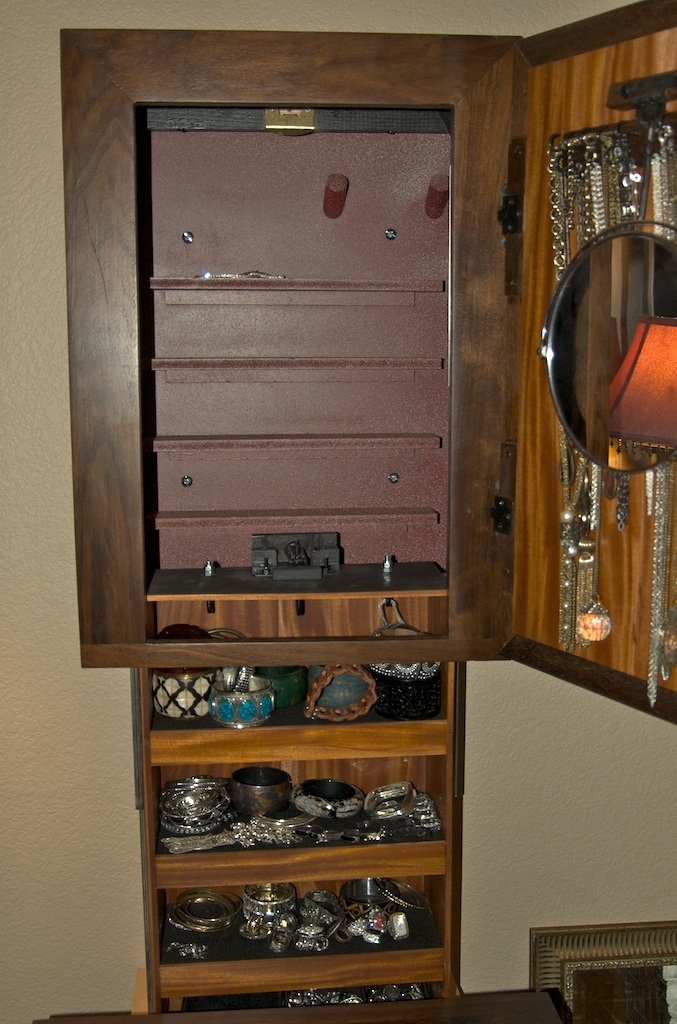 This jewelry box featured on CustomMade.com mounts to a wall and has a side pivoting door to access contents. The interior shelves slide down, however, to reveal a secret jewelry storage compartment behind. This type of storage is nice because a thief is less likely...