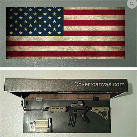 We ran across this example of hidden gun storage at Covert Canvas. The image of a US flag lifts up with an adjustable support hinge to reveal space for your AR15, or other similar weapon, and additional mags and accessories. Each of these Covert Canvas products comes...