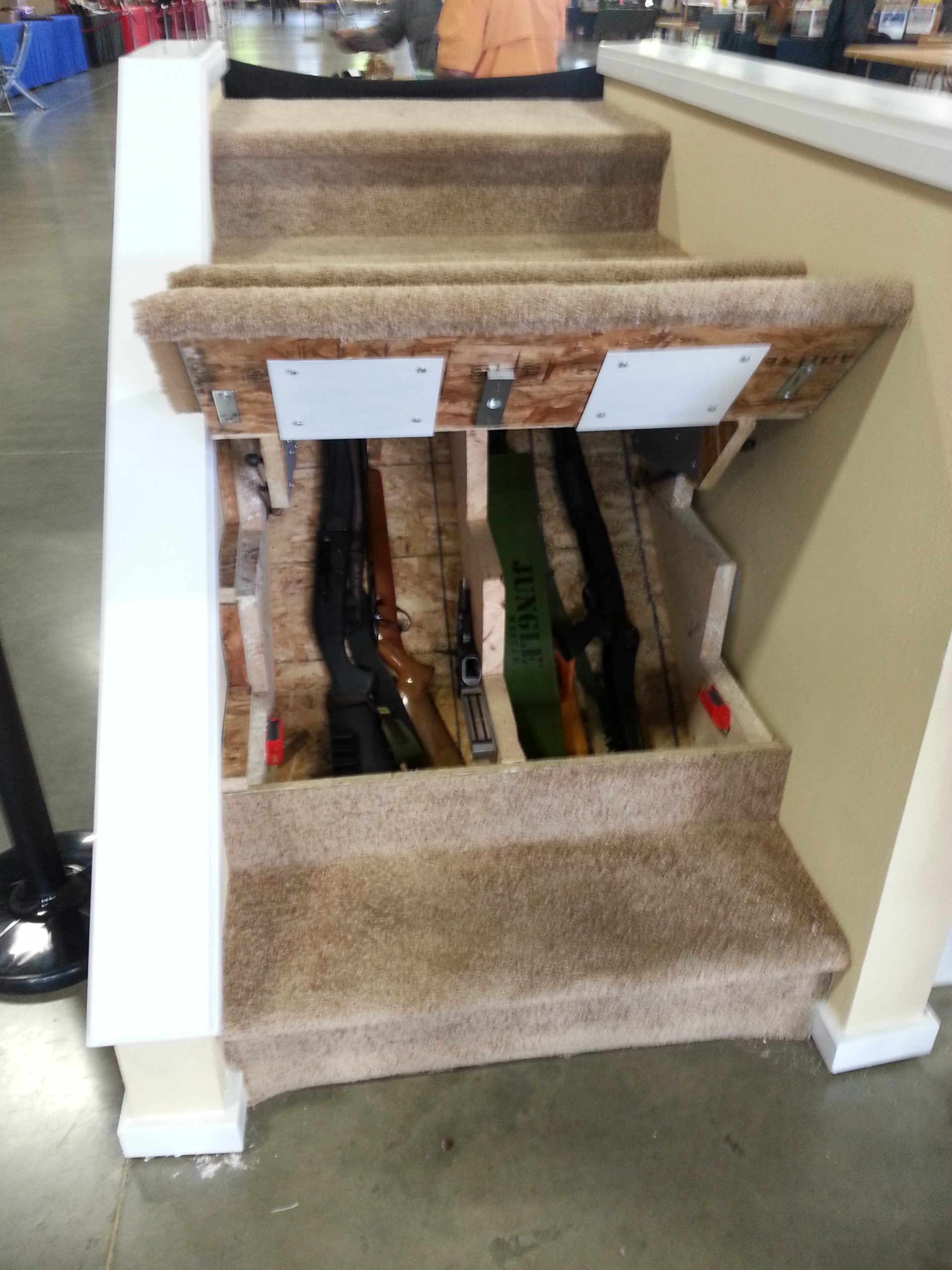 Smart Product Technology makes a kit to turn several of your bottom stairs into a hidden lift-up door. This kit allows you to reach the area underneath the stairs, or space inside the actual framing of the stairs. This can be used for storing guns and valuables. SPT...