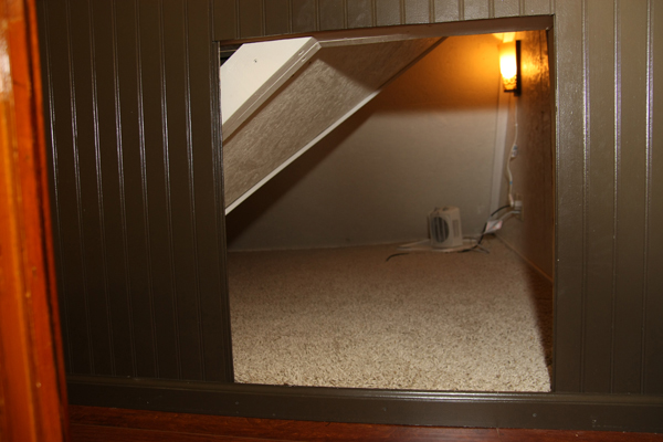 This family opened up the space underneath their stairs. The entrance is through a small concealed door in the back of the closet. Once opened, a secret room with TV and DVD player is revealed.