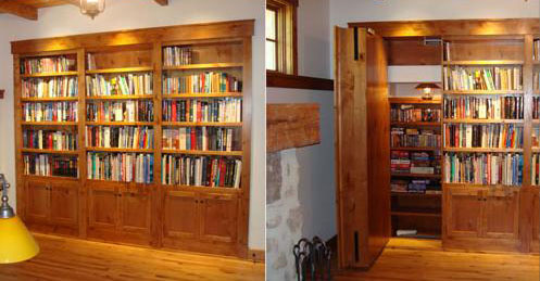 This straight forward secret passage incorporates a swing-out bookcase. One individual set of shelves uses hinges to swing outward and reveal a hidden passage. The other two bookcases remain stationary in the wall.