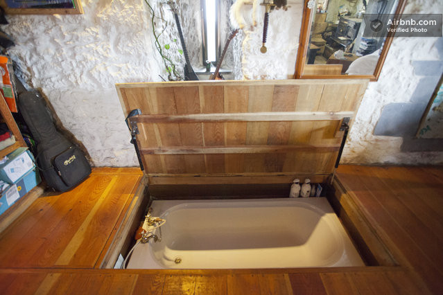 We found this hidden hot tub on AirBNB. The vacation rental is loft style and tight on space. To make the most of what was available, a section of the floor lifts up as a trap door revealing a hidden hot tub beneath.