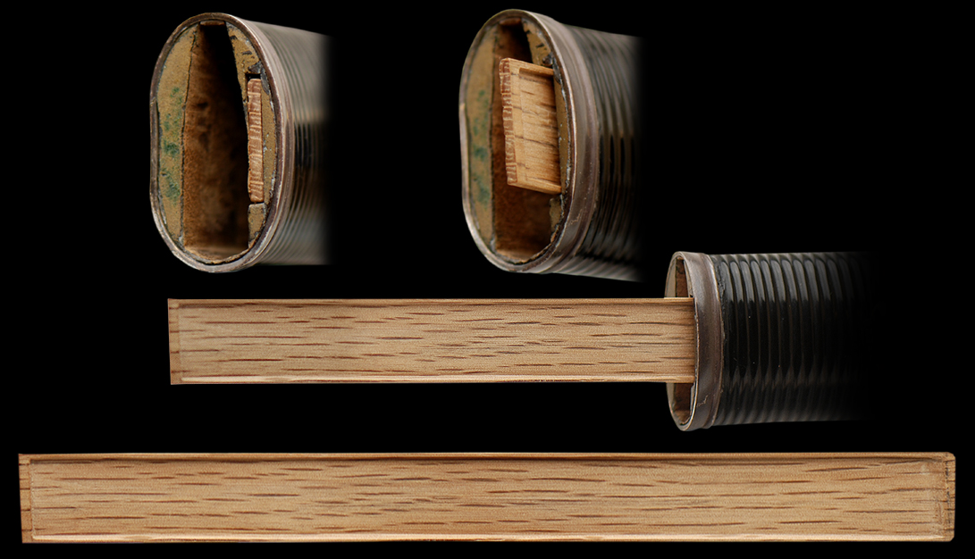 This traditional tantō sword includes a small secret compartment that slides out of the scabbard. It’s thought that they were used to conceal private notes or small gold coins.