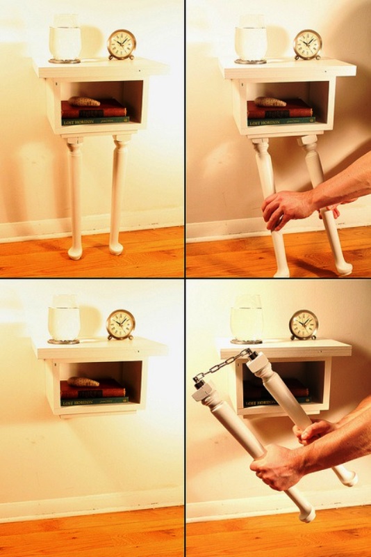This table is mounted to the wall. The legs are for looks only and remove quickly to become impromptu nunchucks should a weapon be needed. Table leg nunchucks aren’t going to be very effective for most people, so this is more of a novelty, but still shows that...