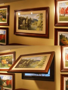 These TV Coverup systems raise a painting or picture up to reveal a monitor or flat screen display behind.