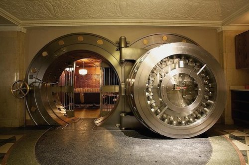 This is the entrance to the vault room at the Bedford in Chicago, IL. The restaurant is built in an old bank building in incorporates the bank features into the interior. The name pays homage to Bedford, IN where the building’s outer limestone originated.