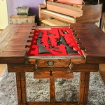 This custom wood table from TheSecretTable on Etsy holds something inside. The top slides out from the center to reveal internal storage for multiple long guns and accessories.